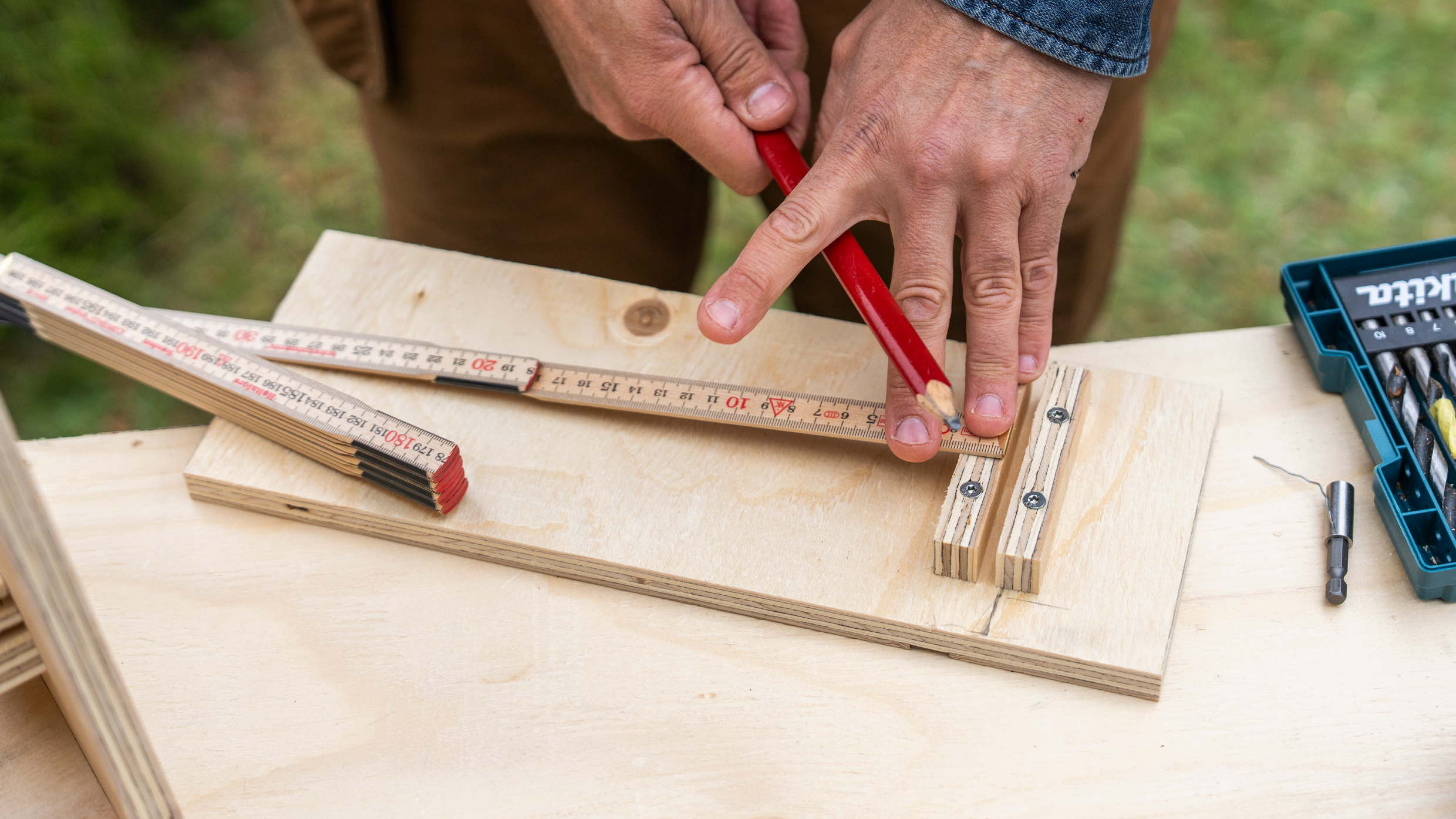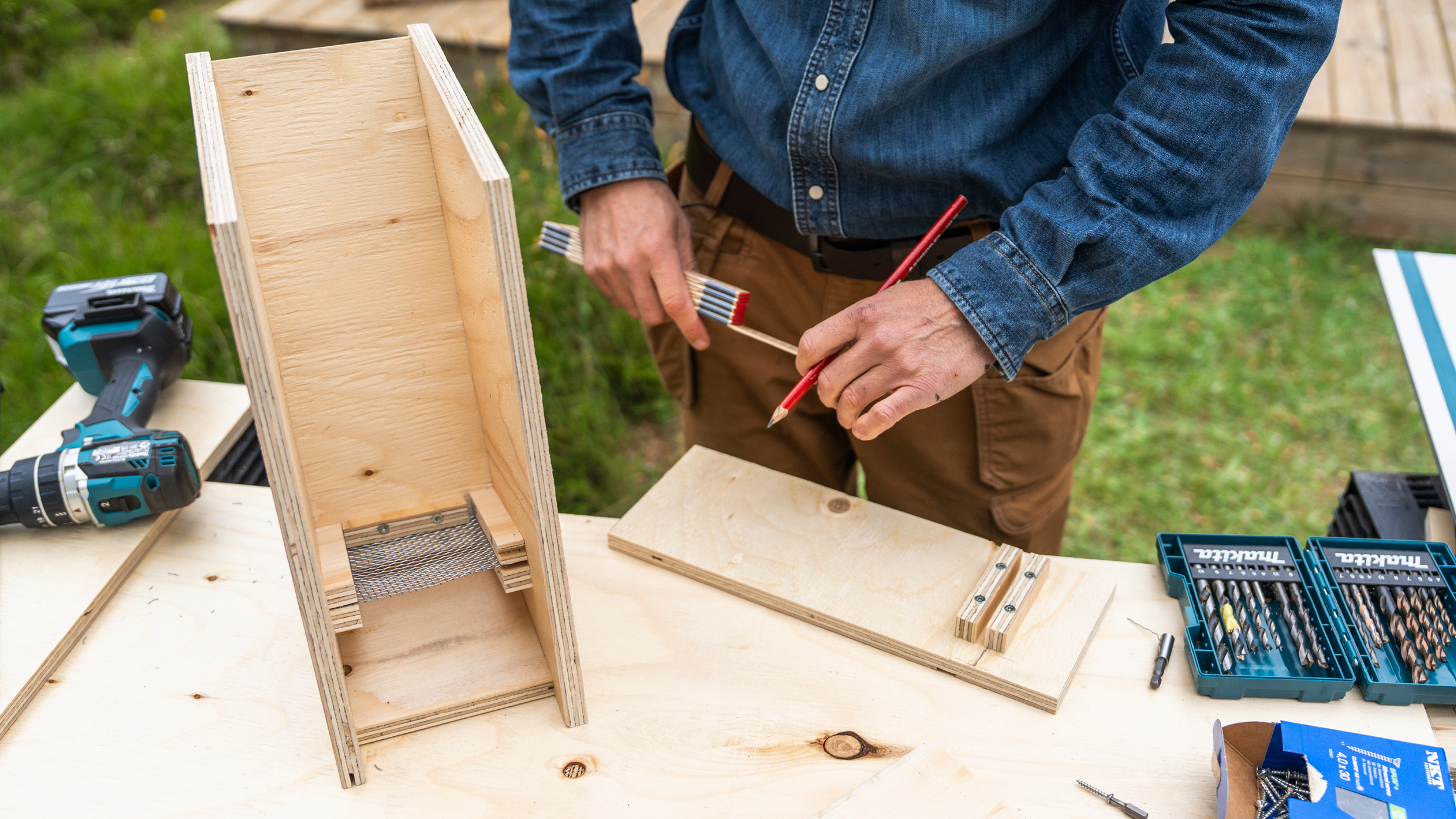 Start med at måle og save krydsfinerpladerne til. Her er de anbefalede mål for redekassens dele: