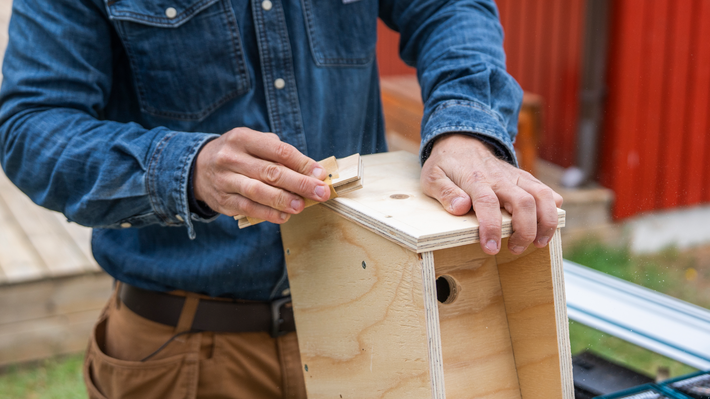 Monter nu frontpladen med indgangshullet. Sørg for, at samlingerne er tætte, så kassen bliver robust og holder til at hænge udendørs i alt slags vejr.