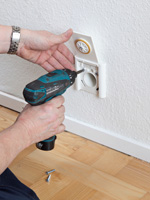 Skru kontakten fast med fire skruer – sørg for, den sidder lige. Da hullerne er aflange, kan du finjustere placeringen.