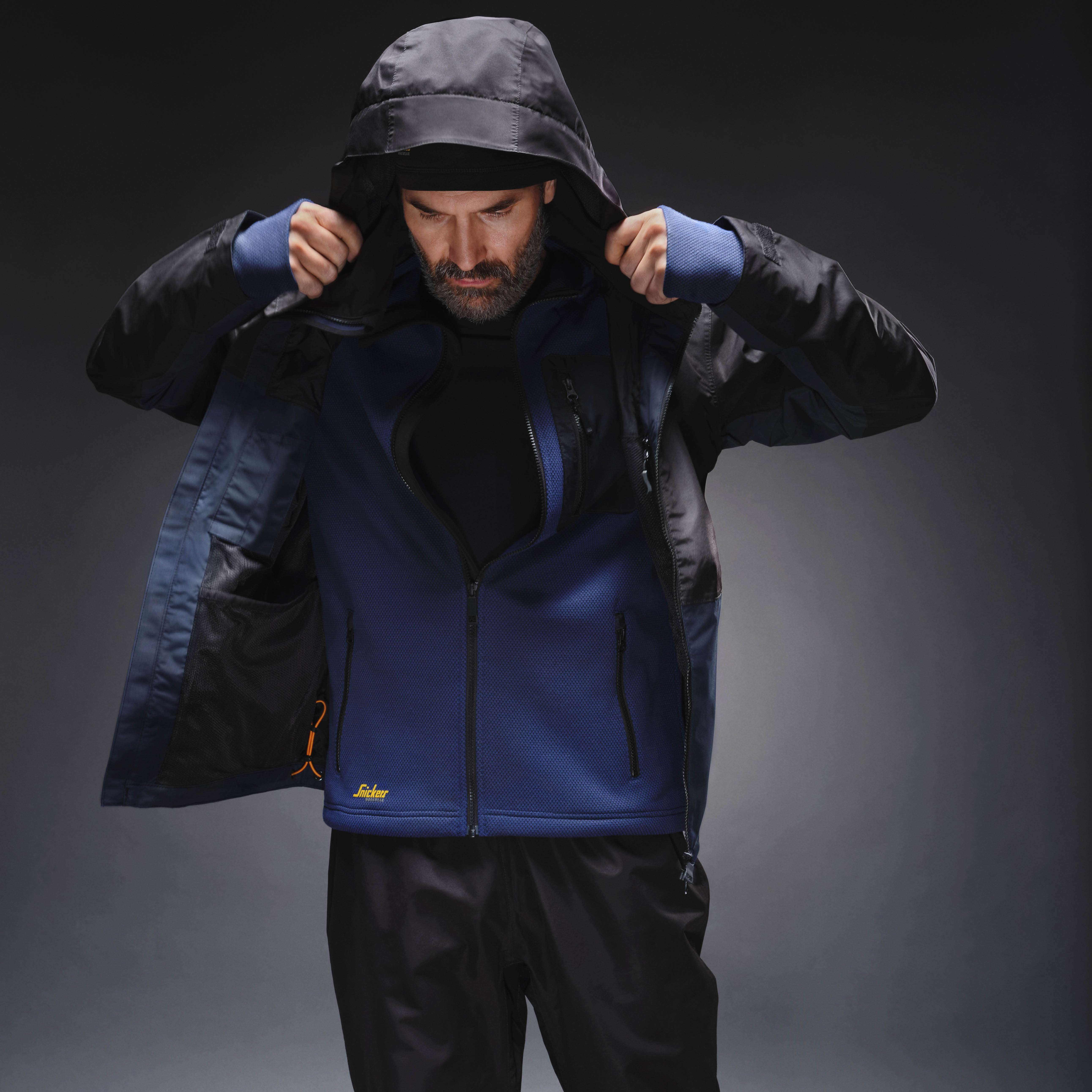 Yderlaget skærmer dig mod vind og regn. Til almindelige forhold er vandafvisende jakker og bukser som regel nok, men i silende regn kræver arbejdet vandtæt tøj med tapede sømme. Når kulden bider, skal du vælge et isolerende yderlag med høj hals, justerbar hætte og manchetter – så du holder varmen inde og elementerne ude.