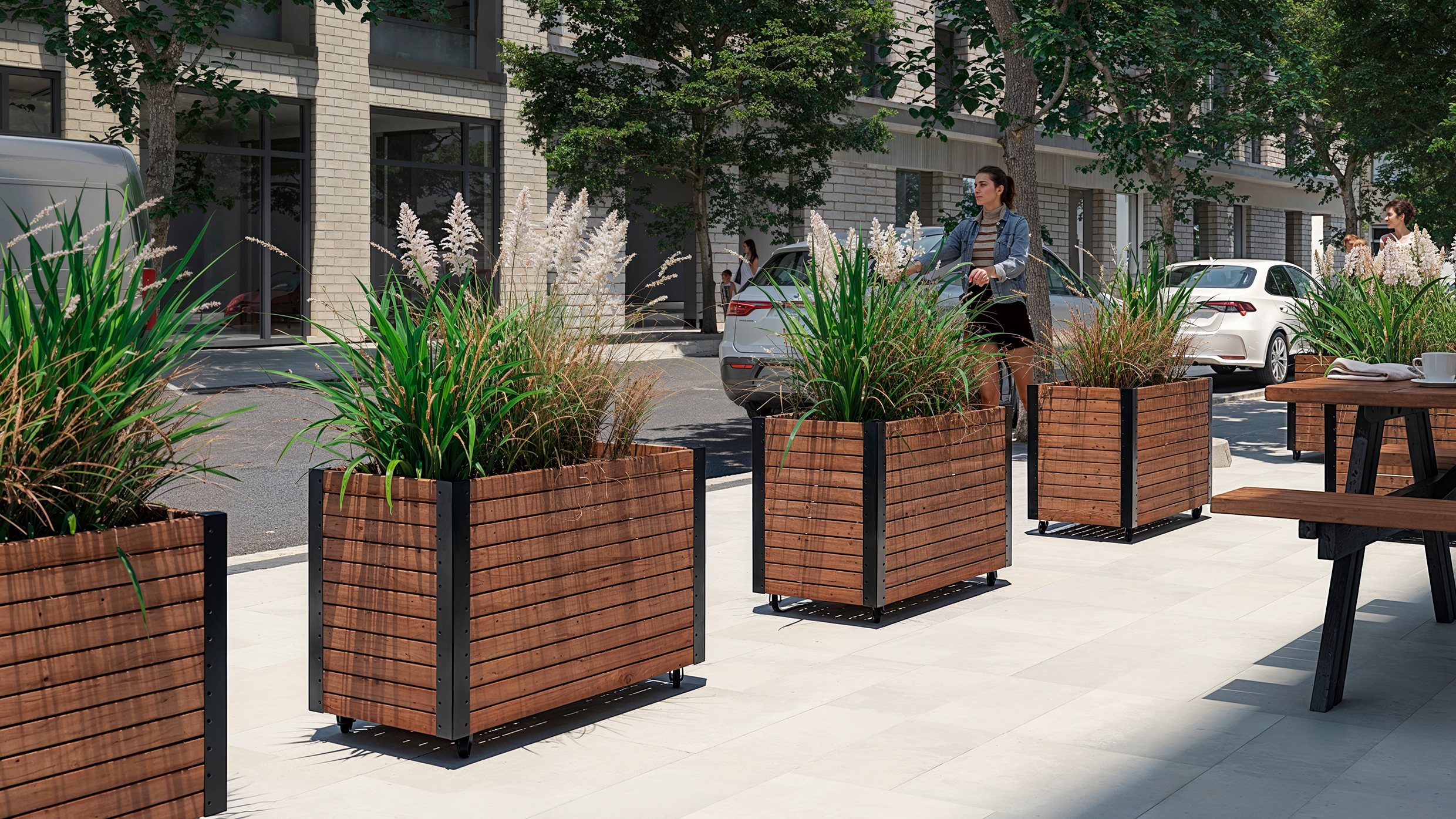 Det enkle design med vandrette trælister og slanke stålhjørner passer perfekt til moderne uderum.