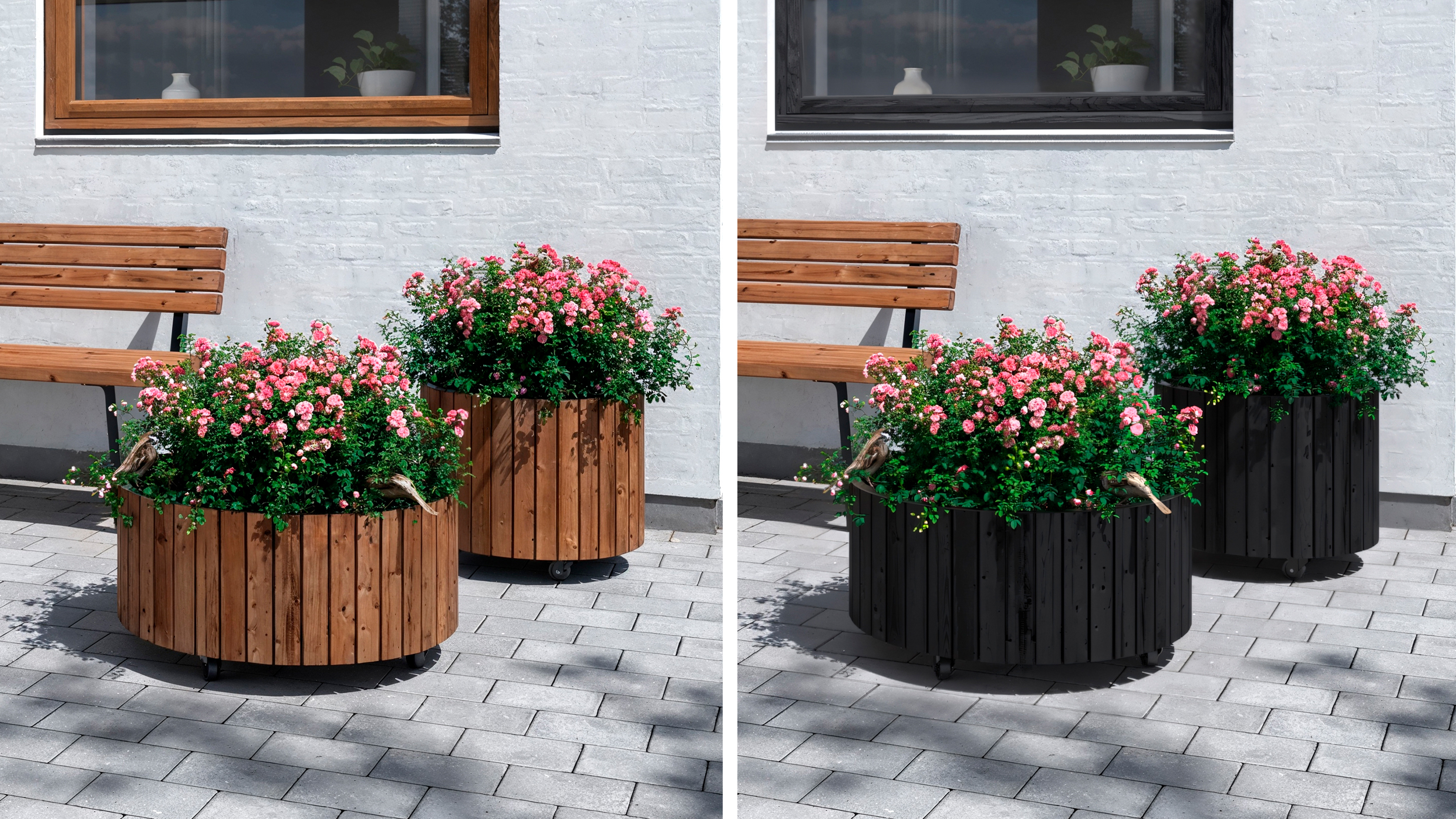 Det stilrene design med lodrette trælister giver et naturligt og tidløst udtryk, der passer perfekt til moderne uderum. I modsætning til traditionelle firkantede kasser tilfører de runde Circle plantekasser en blød og harmonisk dynamik til haven, terrassen eller altanen.