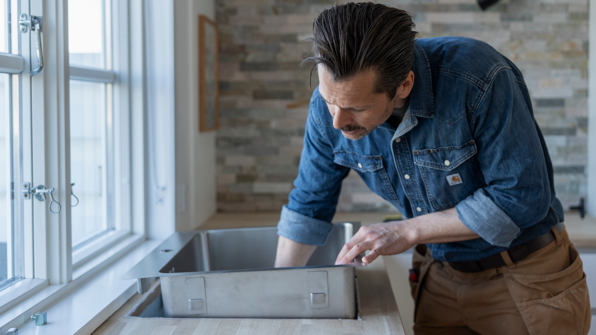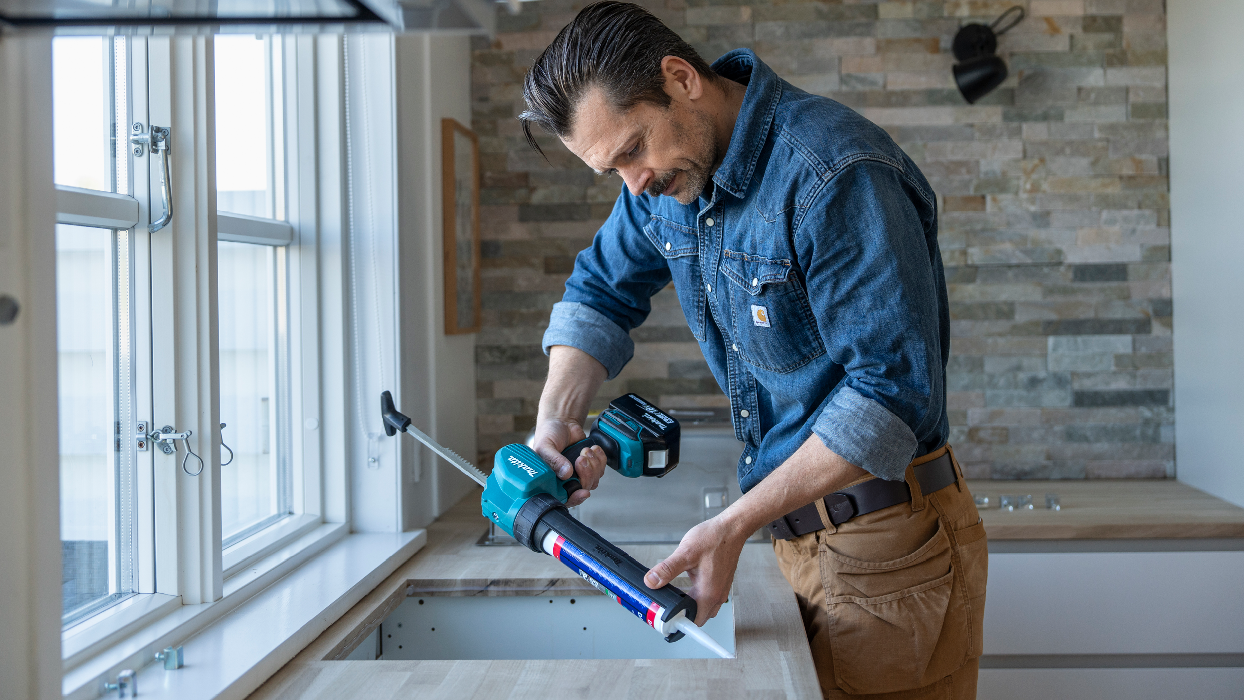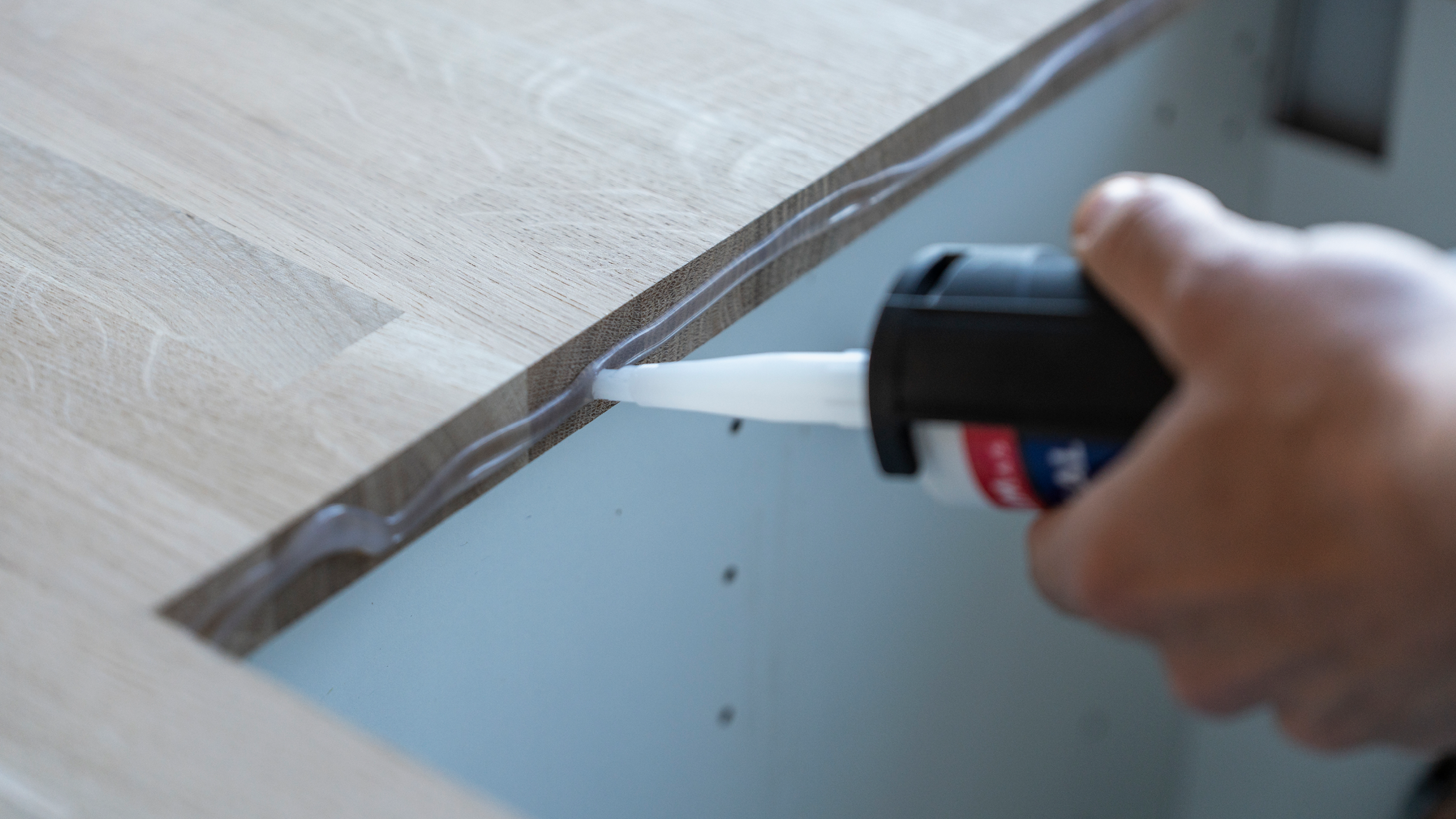 Påfør silikone på hele kanten af hullet i bordpladen. Silikonen sikrer, at bordpladen ikke suger vand, hvis der skulle være en utæthed mellem vask og bordplade. På overkanten af bordpladen påføres en jævn stribe silikone, så vasken slutter helt tæt mod bordpladen og beskytter bordpladen mod fugt – og det forlænger bordpladens levetid.