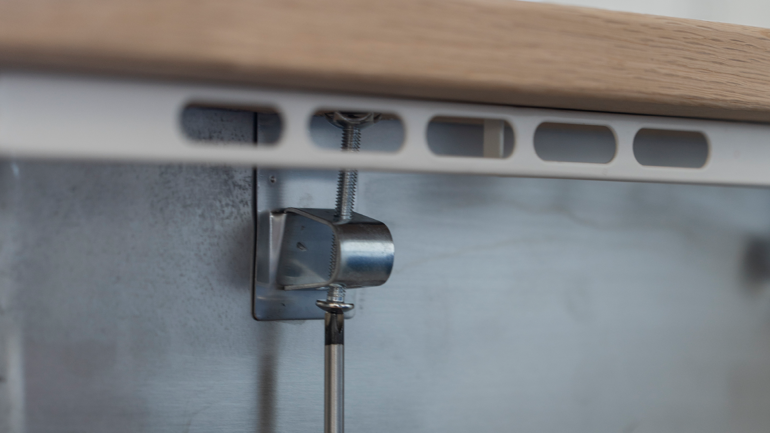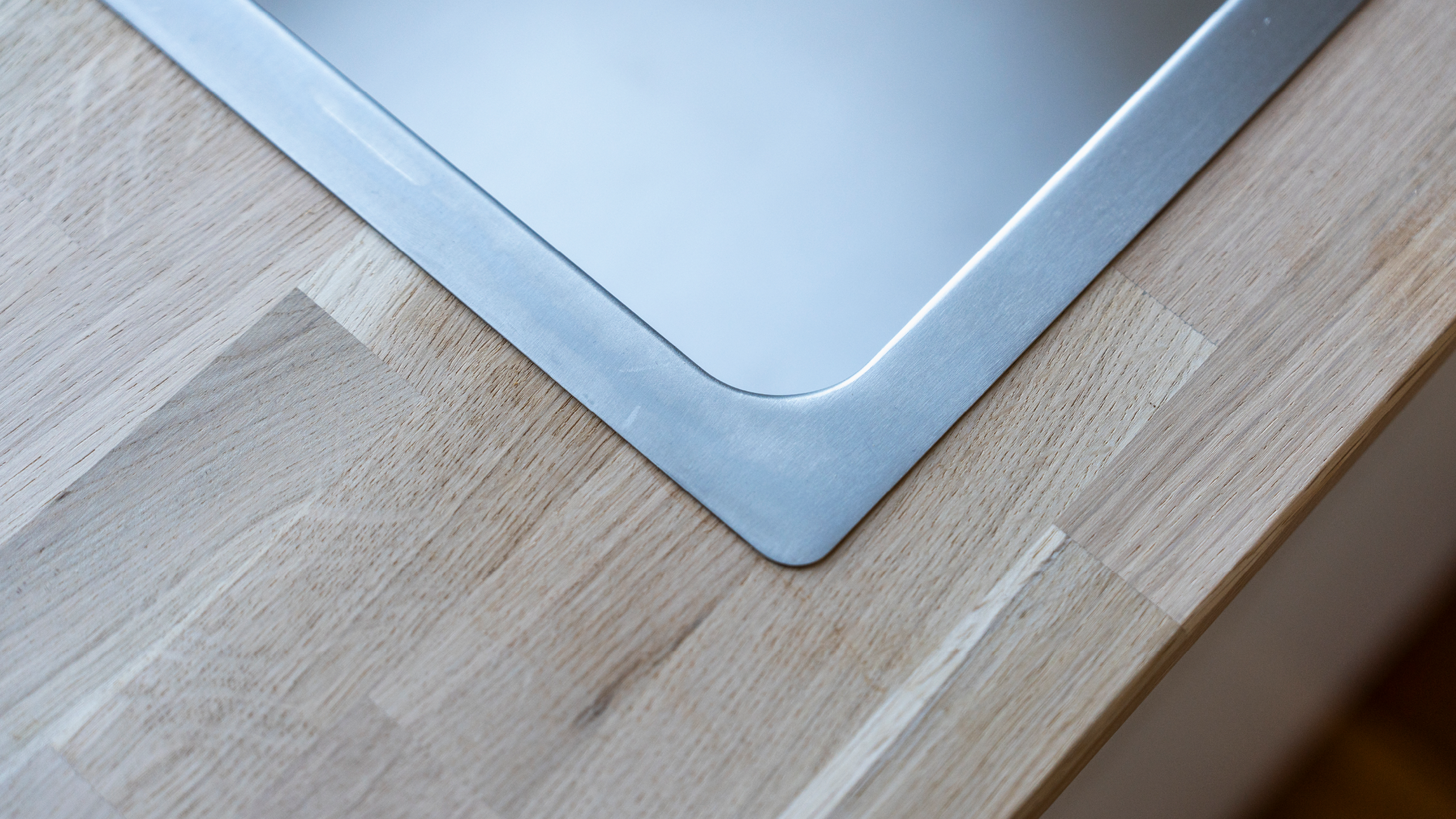 Når vasken er fastgjort, skal du kontrollere, at den sidder korrekt. Tjek, at der er symmetri i forhold til bordkanterne. Lige linjer og præcision giver et pænt og professionelt resultat.