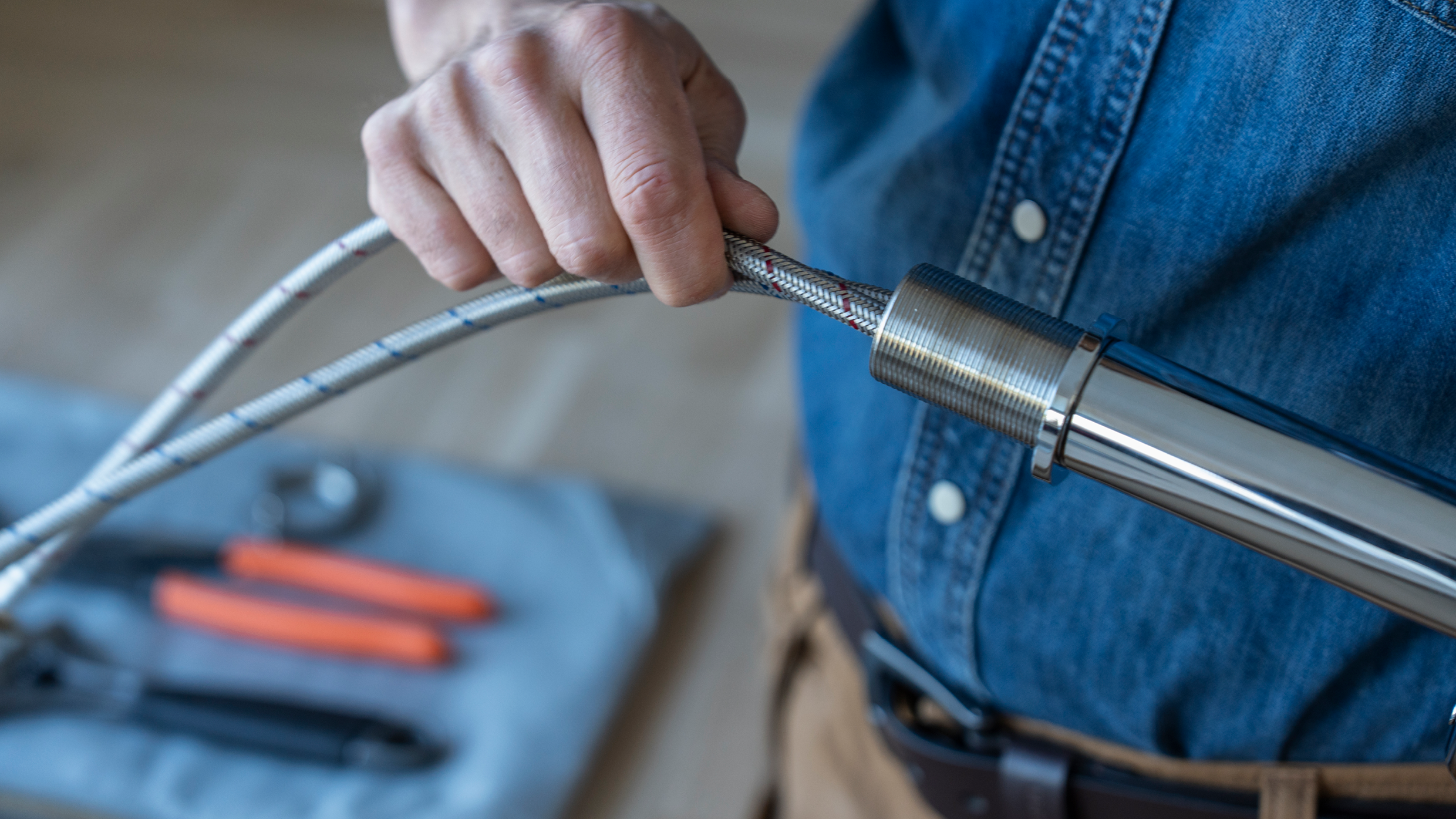 Tag de fleksible tilslutningsslanger og skru dem fast i det nye VASSO køkkenarmatur. Dette kræver ikke brug af værktøj, da slangerne let kan fastgøres med håndkraft.
