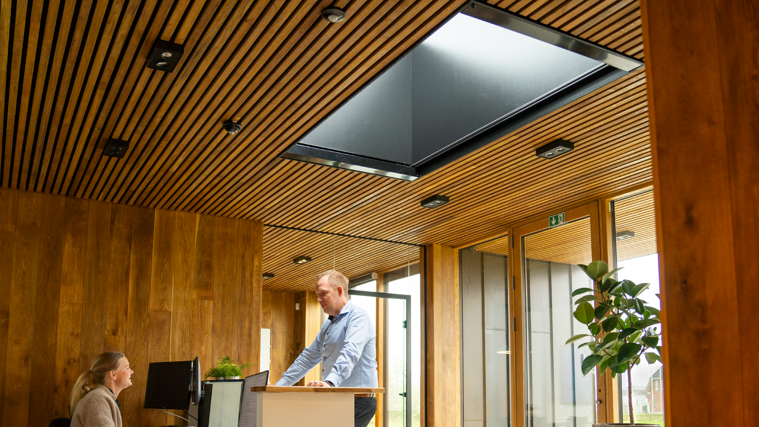 Monolight er specialfremstillede ovenlys med plant glas i én enhed, der effektivt leder dagslys ind i bygningen. I dette projekt blev de anvendt over kontorlokaler, reception og korridorer.